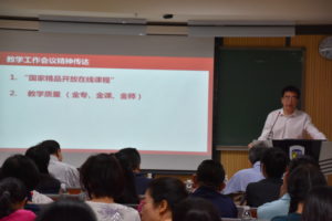蔡鸿首先传达了学校上级工作会议精神,明确了学院在新学期要认真贯彻落实学校“十三五”规划和“双一流”建设工作的目标和工作重点。蔡鸿向全体教职工强调要全面提升学院教学质量,要求学院课程“严起来”,“难起来”,“忙起来”,把本科教育质量实实在在“提起来”,争创“金专”、“金课”和“金师”。 蔡鸿还汇报了今年学院“国家精品开放在线课程”的上报和考核情况,并介绍了学院全国“双带头人”教师党支部工作室在暑期开展的“追寻革命足迹、传承红色基因”活动,要求新学期继续做好基层党支部建设工作,并继续开展“不忘初心、牢记使命”主题教育。