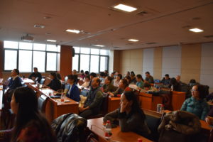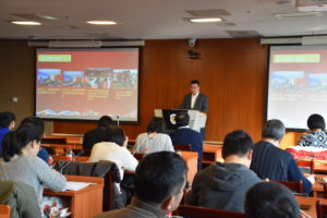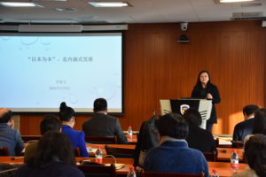 随后,蔡鸿做工作总结。他首先向全体教职员工为学院的发展所付出的辛苦努力表示衷心感谢。随后,蔡鸿从党务、教学、科研、行政、工会、人事、外事、对外交流以及学生工作等方面详细总结了学院所做的工作、特别是在党建、教学和科研中所取得的成绩,其中着重强调了学院在全国高校“双带头人”党支部建设、教学质量、行政管理、科研成果全面提升等多个亮点,并向大家通报了学院下学期人员变动情况,其中包括下学期援疆支教人选。