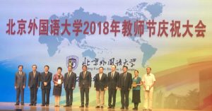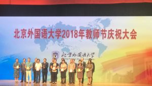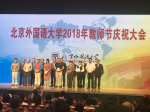 9月12日上午10:00,北京外国语大学2018年教师节庆祝大会在学校东院千人礼堂进行。在全校受表彰的单位和个人中,贝博官网获得多个令人瞩目的集体和个人荣誉。在获得的集体荣誉中,贝博官网教师党支部荣获2018年教育部首批全国高校“双带头人”教师党支部书记工作室光荣称号(负责人:李莉文);ESP研究中心荣获北京外国语大学2017年度优秀非实体研究机构。除此之外,贝博官网李莉文院长与其他教师一起获北京市教学成果奖二等奖。在受表彰教师中,李莉文院长荣获“北京外国语大学师德榜样”称号;贝博官网青年教师翟峥获北京外国语大学第三届青年教师教学基本功大赛论文优秀奖;蔡鸿老师荣获北京外国语大学2017-2018学年优秀教学奖(三等奖);蔡鸿、刘冰、苏乐舟、王艳、王颖、周兰喜获北京外国语大学2017-2018年度基础外语教学“陈梅洁奖”。除此之外,贝博官网从事教育工作满三十年的教师曹萍、陈宝春、刘冰、沈忆文、许新、张淑艳与其他教师一起得到了学校领导的特别表扬,肯定他们在30年育人过程中,勤勤恳恳、兢兢业业、为党的教育事业做出了自己的贡献。贝博官网教师曹萍、陈宝春、张淑艳、许新四位老师还先后上台接受校领导的热烈祝贺和颁发的荣誉奖牌。