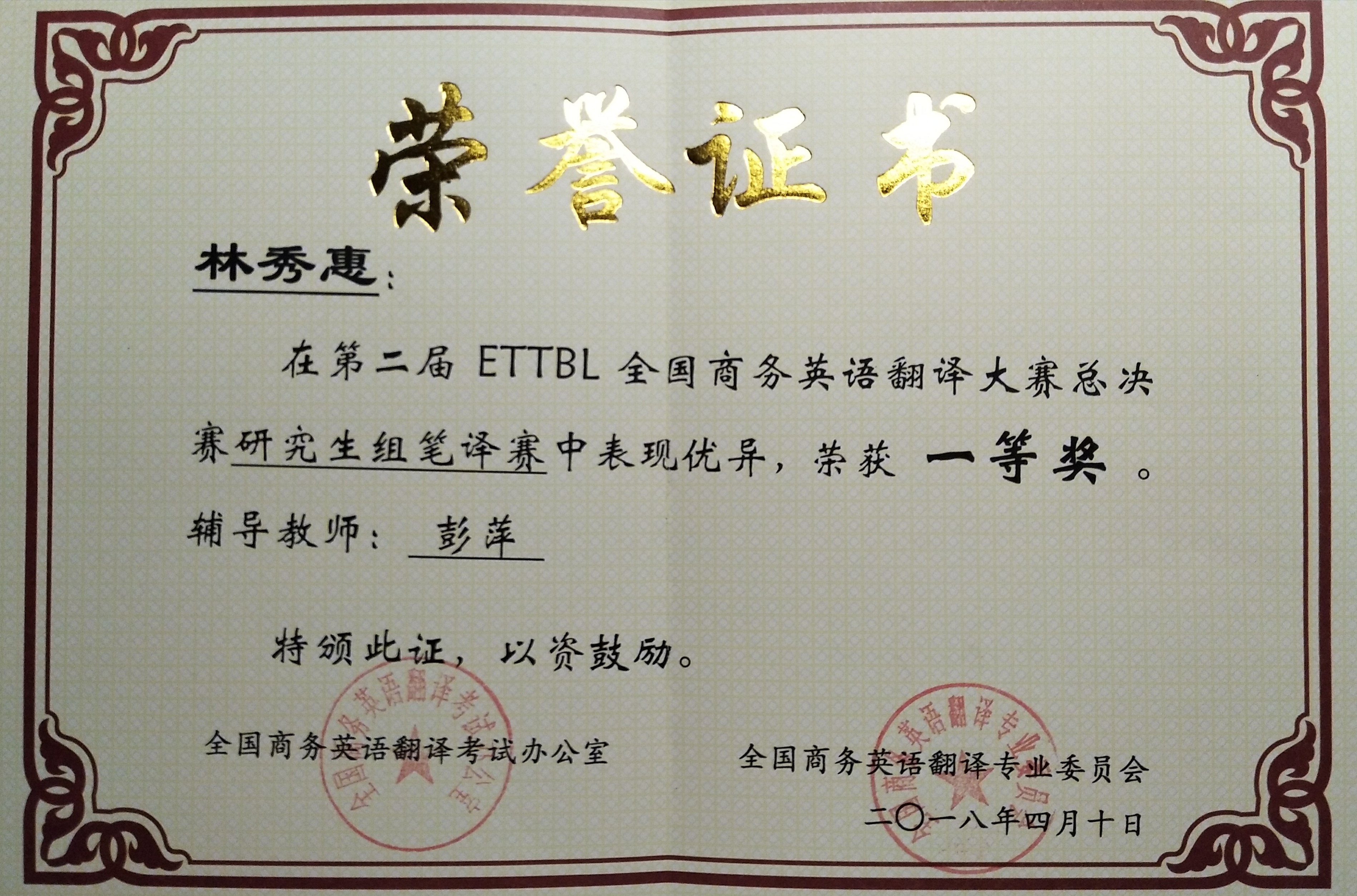 随后,大赛的口译组决赛正式拉开帷幕。贝博官网副院长彭萍教授、教师王艳教授在决赛中受邀担任评委。下午四时,大赛举行了隆重的颁奖仪式与闭幕式。在此次决赛中,我校荣获“最佳组织奖”,英语学院2016级研究生渠超男同学获研究生口译组二等奖;贝博官网2017级MTI林秀惠同学荣获研究生笔译组一等奖。