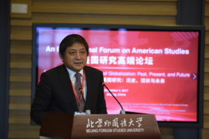论坛发言阶段,11位来自中美两国的美国研究领域的优秀学者,围绕“全球化背景下的美国研究”主题进行了主旨发言。专家学者就中美两国学者在美国研究领域的研究定位、研究内容、研究方法和研究成果进行了深入剖析和反思,论坛上的主旨发言和交流对话广泛涉及中美政治外交关系、美国社会文化与文学艺术、美国少数族裔、美国史学研究等多个主题。